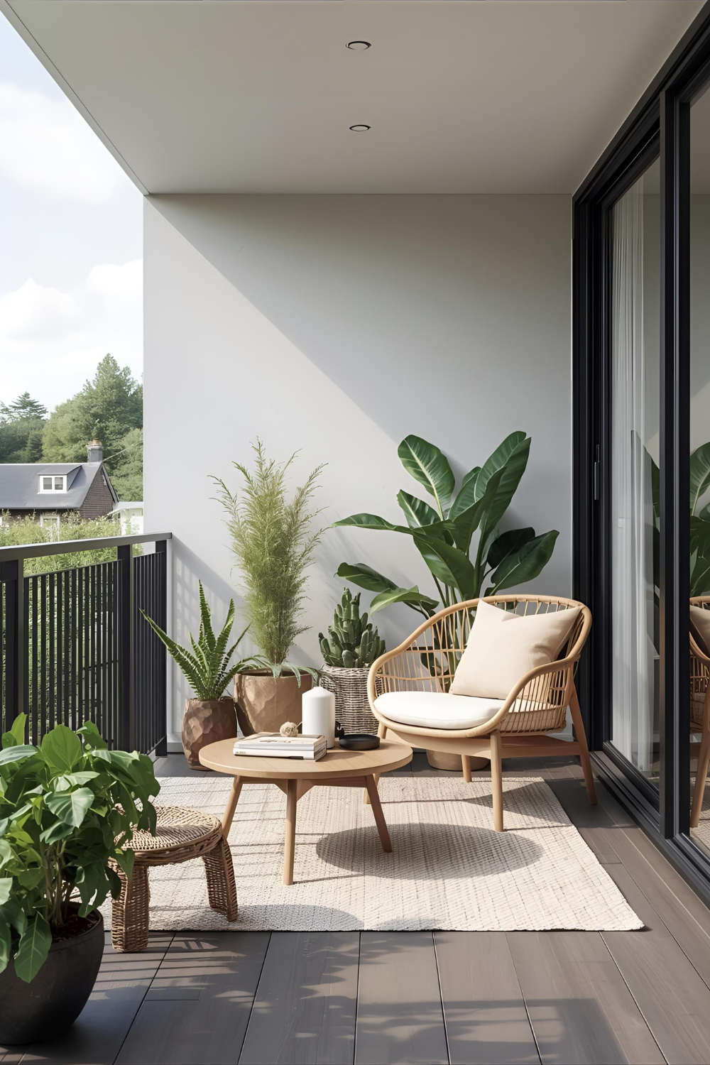 An outdoor rug instantly defines your space, making it feel like an extension of your living room. Choose a neutral, minimalist rug that complements your furniture and creates a cozy atmosphere.
